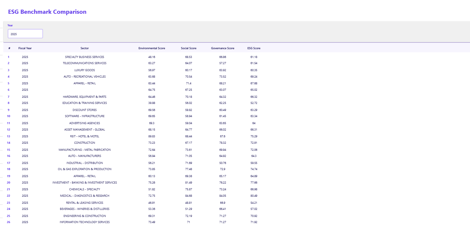 For example, in 2025, the Software sector had an average environmental score of 69.32 and a governance score of 61.45. In contrast, the Luxury Goods sector had an environmental score of 56.97 and a governance score of 69.65. This illustrates that a single, market-wide benchmark would be misleading.