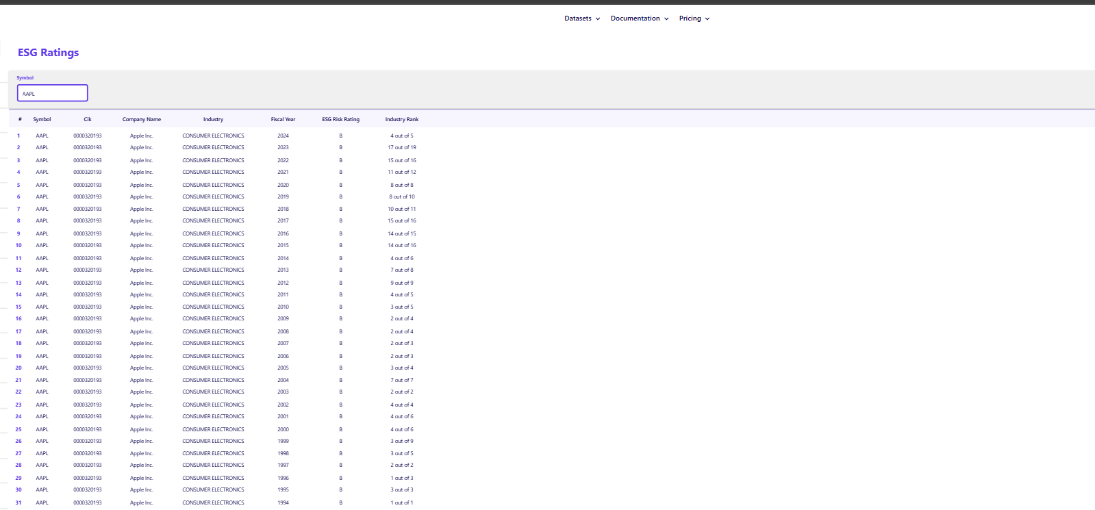 The ESG Ratings API shows Apple Inc. with an ESG risk rating of "B" and an "Industry Rank" of 4 out of 19 in 2024, indicating its specific standing within its industry. This contextual ranking is essential for a fair comparison and for a systematic backtest.