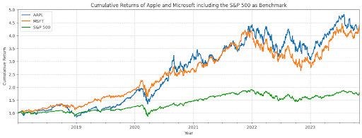 Cumulative returns can be visualized alongside benchmarks like the S&P 500, helping you see how your investments stack up against the market: