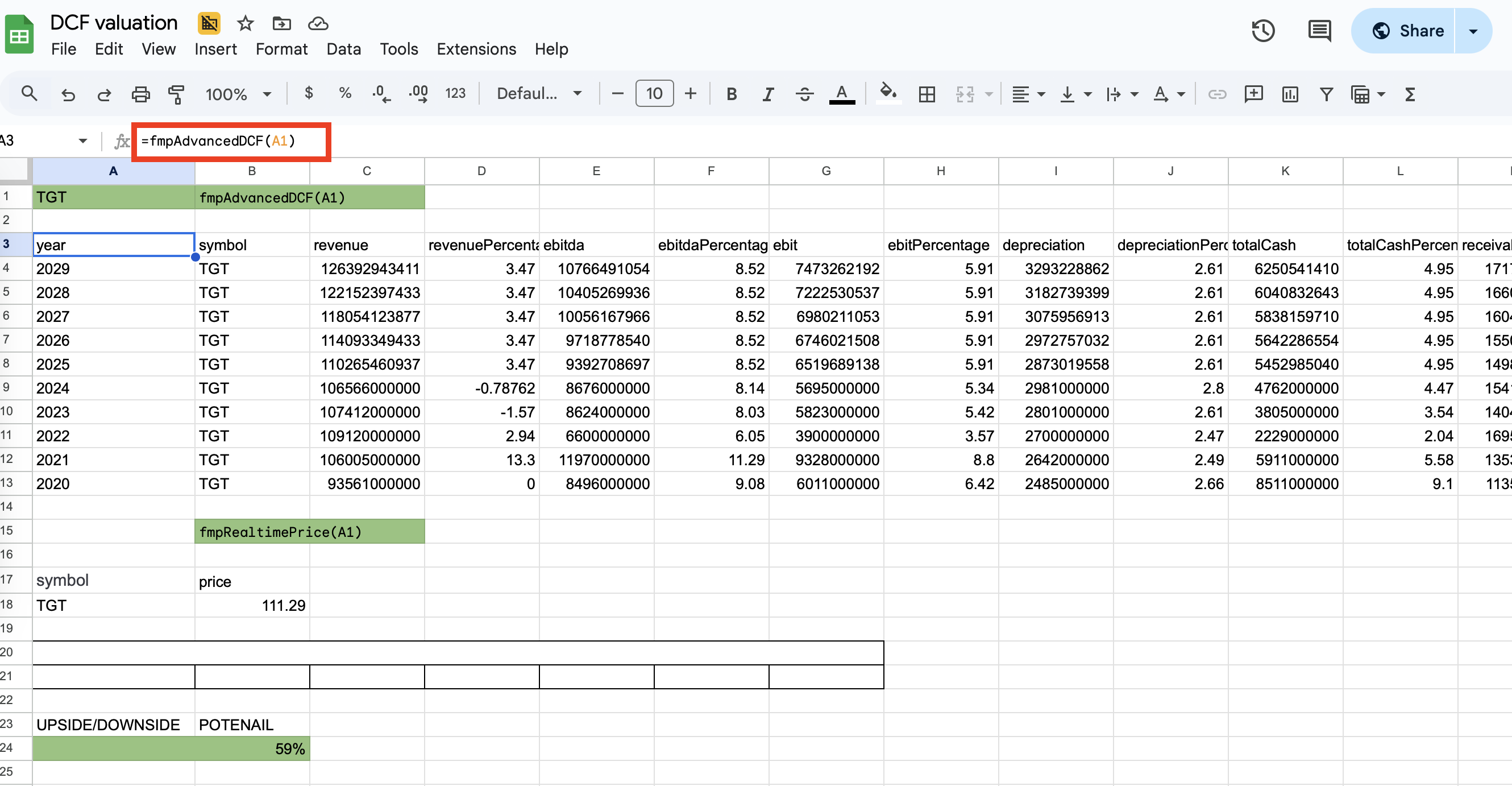 DCF model in Excel using FMP data.