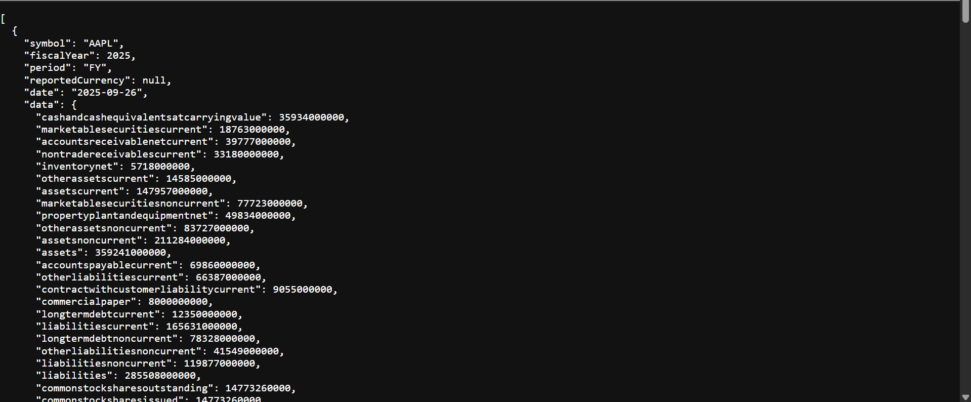 By calling the API with the following structure, you can access the historical balance sheet data required for the calculation. This endpoint can be looped across symbols for large-scale screening workflows, provided your data plan supports the necessary request volume for broad market coverage.
